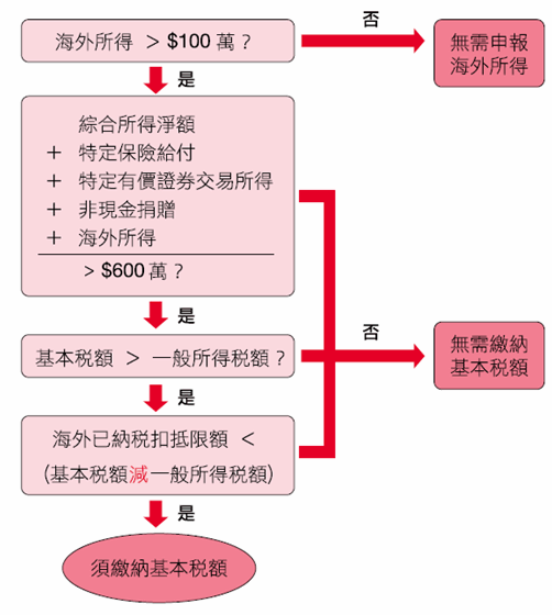 (1) 若同屬應課稅的所得(例如股利、利息等),投資國內所產生的所得,在兩稅合一稅制下,最終稅負將達40%;只是,投資海外所產生的所得,雖然要納入基本所得額課稅,但每年有600萬可扣除,且稅率只有20%。